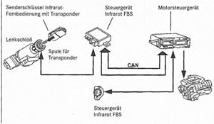 Neue R129 mit CAN haben eine eingebaute Wegfahrsperre (Abbildung 8). Deren Aktivierung und Deaktivierung erfolgt über eine Datenübertragung am Lenkradschloss. Der integrierte Transponder im Infrarot-Zündschlüssel bewirkt, dass dessen Signal in einer Spule im Lenkradschloss empfangen und an das Infrarot-Steuergerät übertragen wird. Diese Funktion des Transponders ist unabhängig vom Zustand der Batterie im Zündschlüssel.