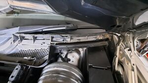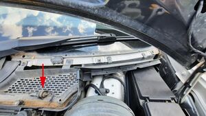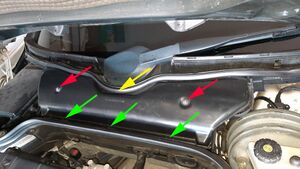 Das gibt den Blick frei auf die Wasserabläufe des unteren Randes der Windschutzscheibe. Diese tragen an der Oberseite ein Metallnetz und sind mit Kreuzschlitzschrauben befestigt. Die Wasserabläufe werden entfernt.