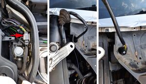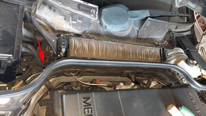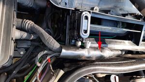 Vor dem Ausbau des Wasserableiters sind noch Unterdruckverbindungen zu lösen (siehe Foto, rote Pfeile). Die Verbindungen waren sehr fest und es bestand die Sorge, dass die Kunststoffteile beim Aufhebeln brechen könnten. Doch glücklicherweise hielten sie der Belastung stand und waren auch nach dem Zusammenbau alle wieder dicht. Zumindest ist kein Funktionsausfall der Lüfterfunktionen eingetreten.