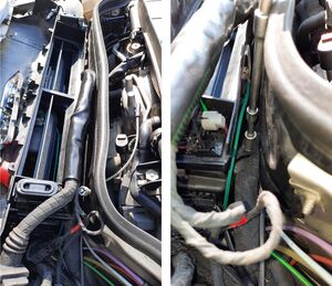 Jetzt können die Befestigungsschrauben des Wasserableiters gelöst werden. Es handelt sich um 8 Schrauben M6 und zwei Gummipuffer. Jetzt trat das bereits beschriebene Problem auf, dass die vorderen Schrauben von einem Kabelbaum überdeckt werden. Der Kabelbaum verläuft zwischen dem Wasserableiter und der Schottwand zum Motorraum.