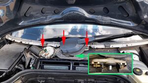 Zum Ausbau der Scheibenwischanlage werden drei Muttern M6 (rote Pfeile) entfernt und das gesamte Teil und aus der Halterung gezogen, die sich unterhalb der Drehachse unter der kleinen Plastikverkleidung verbirgt (Bild 10, grüner Pfeil und Einschaltbild).