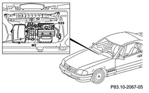 Das Gebläse befindet sich im Zwischenaggregateraum unterhalb des Scheibenwischers. Die Abbildung aus dem R129 WIS zeigt die Lage im Fahrzeug.