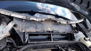 Nach der Entfernung des Staubfilters (Bild 7) sieht man auf den Gebläsemotor und den Gebläseregler. Als nächstes werden die beiden eingeclipsten flexiblen Gitter auf der rechten und linken Seite unterhalb der Windschutzscheibe abgebaut. Da sie brüchig sein können, ist vorsichtige Behandlung nötig.