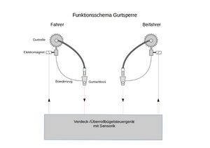 Die Gurtrolle wird mechanisch durch einen Bowdenzug gesperrt, sobald die Gurtzunge im Schloss einrastet. Gleichzeitig wird aber im Gurtschloss ein Mikroschalter betätigt, der dem Verdeck-/Überrollbügelsteuergerät signalisiert, dass der Insasse sich angeschnallt hat. Daraufhin werden immer die Gurtrollen beider Sitze über Elektromagneten entsperrt. In Bild 1 ist das Funktionsschema dargestellt. Erkennt die Sensorik im Steuergerät eine starke Verzögerung des Fahrzeugs oder einen drohenden Überschlag, werden die Gurtrollen sofort gesperrt.